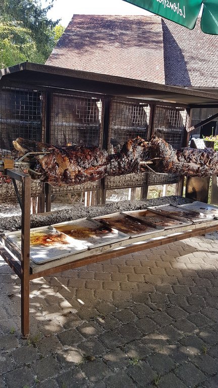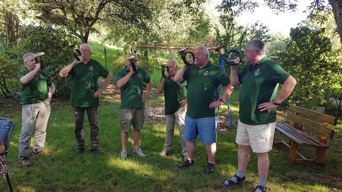 Am 10. August 2024 führte die Bläsergruppe Staufen-Münstertal ihren diesjährigen Bläserausflug in unserer Region durch. Schwerpunkte waren dieses Mal das Schloss Bürgeln, Kandern - Kandertalbahn sowie das Abschlussessen im Landhgasthof Engemühle bei Efringen-Kirchen. Dort gab es für die vielen anwesenden Gäste zwei ganz gegrillte Wildschweine vom Spieß, welche der Gastronimieinhaber Egon Baßler in seinem Jagdrevier zuvor selbst erlegt hatte. Zu dieser kulinarischen Köstlichkeit wurden den anwesenden Gästen passend zum dargebotenen Essen jagdmusikalische Stücke vorgetragen, die mit sehr viel Beifall belohnt wurden.